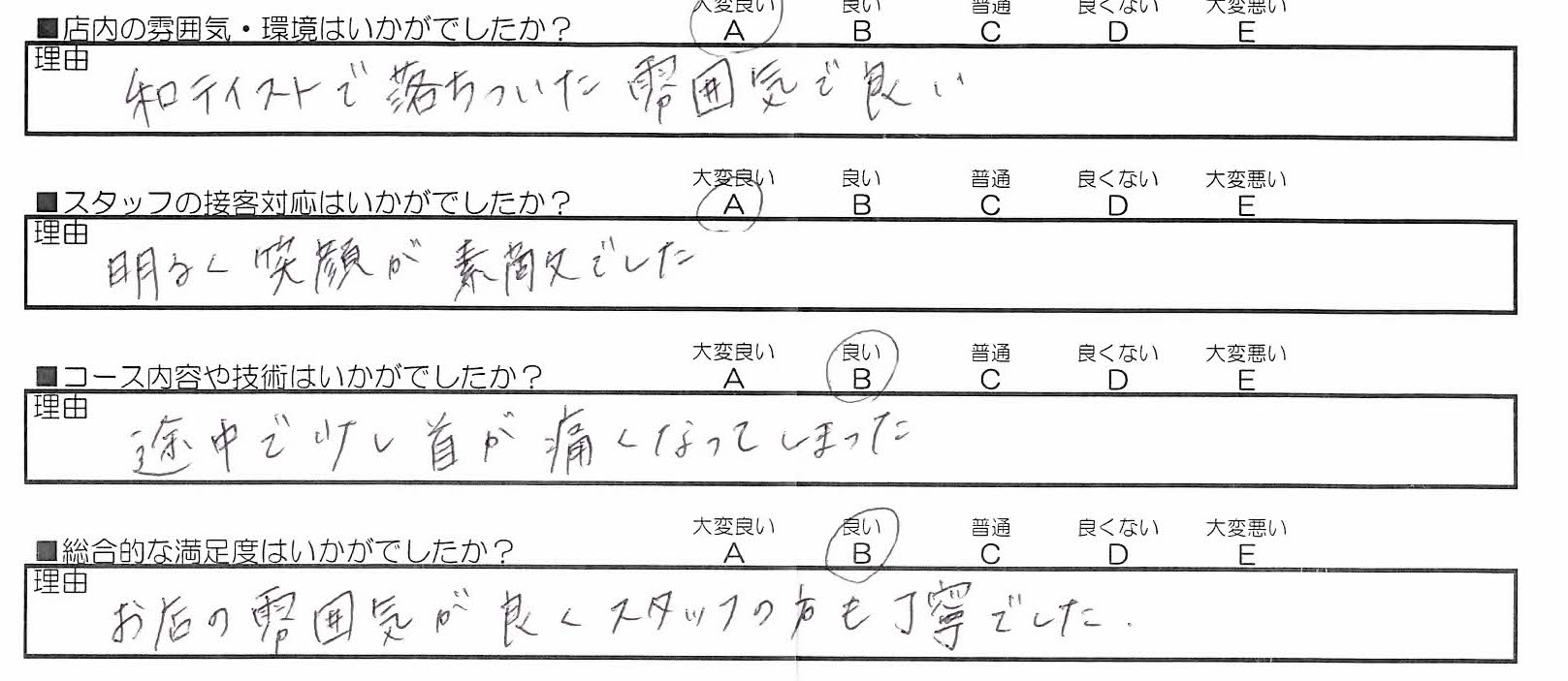 コース内容:とても技術のレベルが高くビックリしました。悩みにも親切によりそった提案をして下さりうれしかったです。